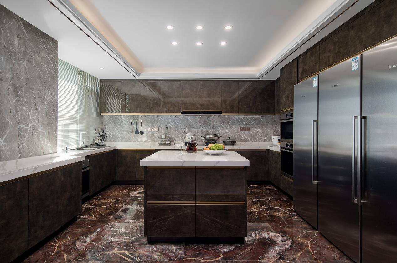 U型厨房拥有极大的空间包容度,动线合理,契合业主一家对于品质厨房的追求。咖色与白色拼接的大理石操作台搭配定制橱柜,不仅美观大气,而且实用,能满足日常生活需求。