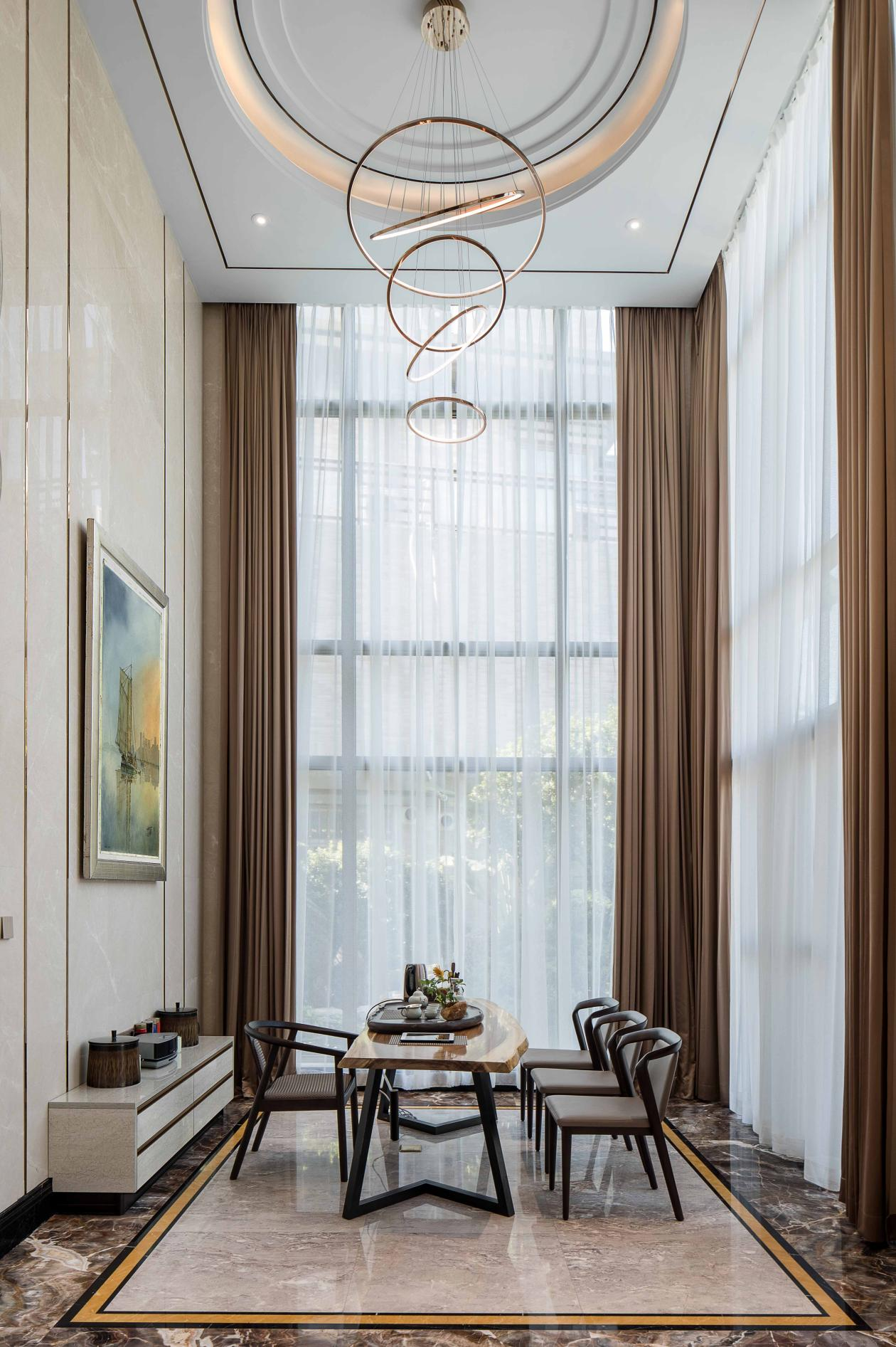 靠窗打造茶室,大落地窗能让人轻松地将自然光景尽收眼底,茶室选用原木的茶几与茶色的座椅,让人感到自在悠闲。金属圆环的吊灯,在简单与重复的交织中,营造出吊灯在半空中舞蹈的轻盈感,让茶室更显休闲惬意。清晨的暮霭,午后的暖阳,傍晚的落日与七彩云霞,都是自然的馈赠。在此,一杯茶,一方美景,一段好时光。