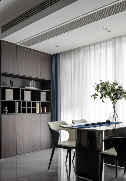 将阳台纳入屋内,与客厅相通,设置品茗区。储物柜中部镂空,开放式与闭合式收纳结合,既可用来陈列展示,也可收存物品,实用性超赞。