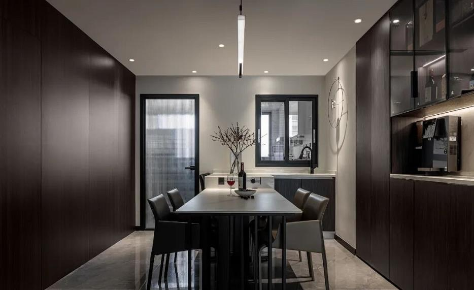本案设计师充分挖掘空间潜力,对厨房和餐厅位置都进行了移动,将厨房移到生活阳台,原厨房区域变为餐厅,拓宽空间。顶面的吊灯与辅助灯散发着暖光,照射在墙面上、地板上和餐桌上,营造出温暖自然的就餐氛围。