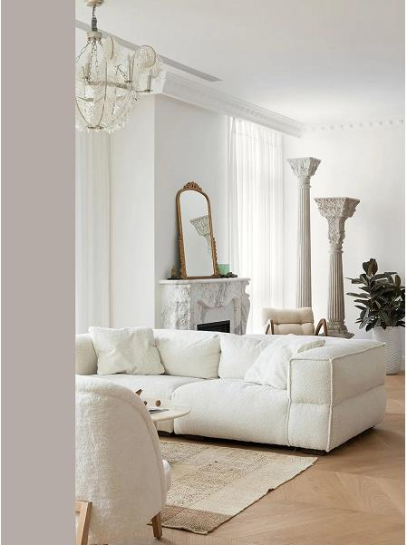 设计师将曲线元素应用于空间中,改变原有客厅的内凹格局,设计拱形门洞,造型优美。整个客厅空间没有太多颜色去做修饰,鱼骨拼木地板搭配奶油白色墙面,给人温馨宁静的感觉。法式围边点缀的吊顶与主吊灯组合,浪漫的气息散发在空间的每个角落。