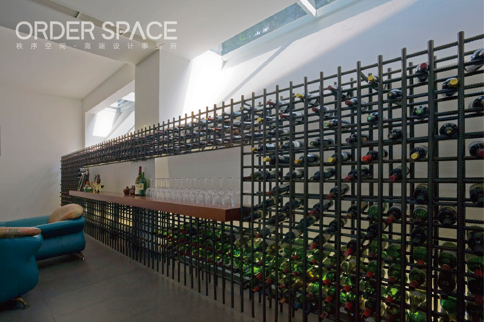 在休闲厅内,最引人注目的占据了整整一面墙酒架,各种存酒有序的存放在每一个格子中。在酒架内内嵌长方形空间,集酒具展示、倒酒台于一体,展现美感的同时达到功能最大化利用。