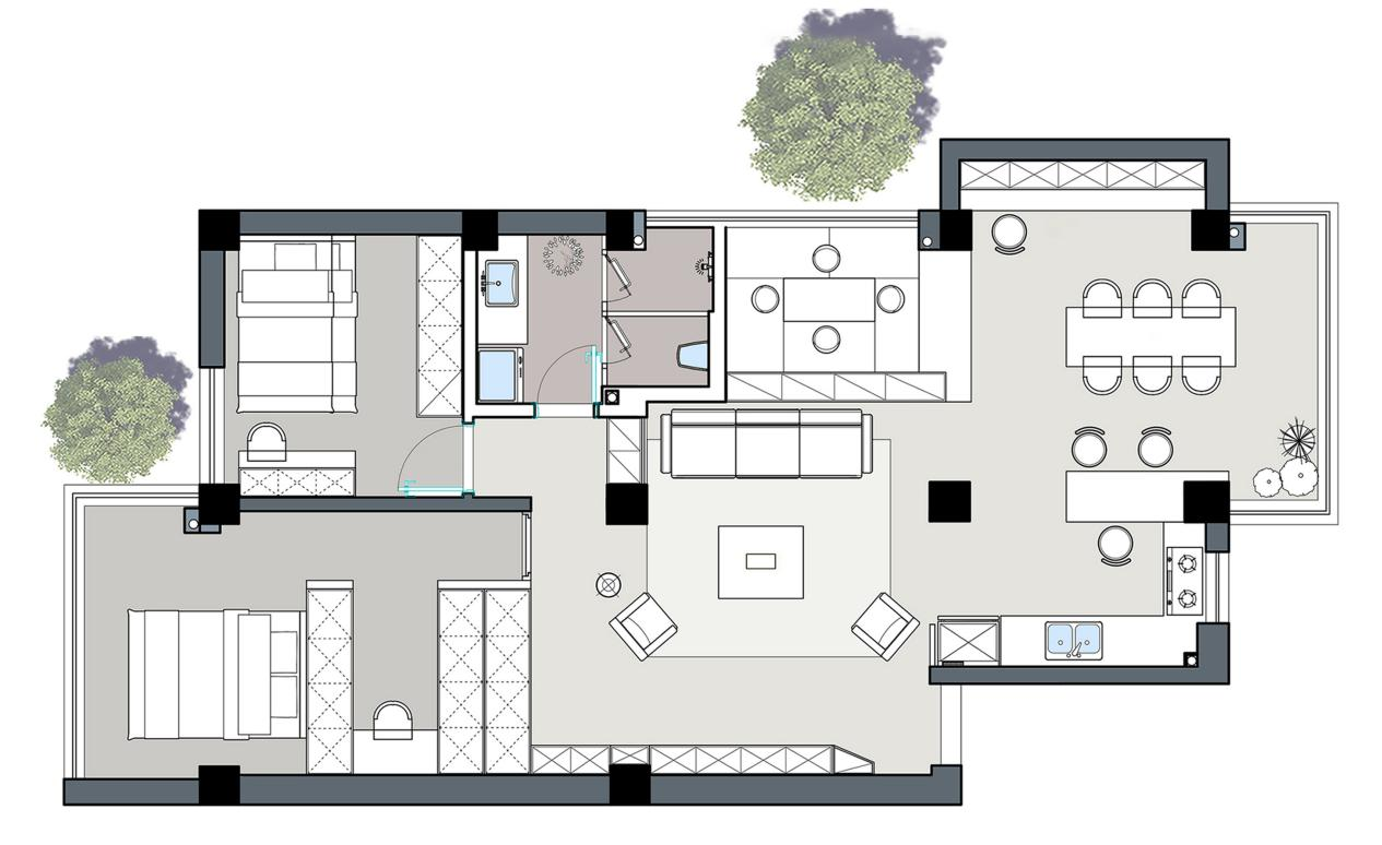 本案设计最大限度从材料到格局通透、对流,引光入室去维护空间平衡,利用裸露的梁柱结构与开放格,形成天然的屏障,仿若在空间中置入了一个盒子。