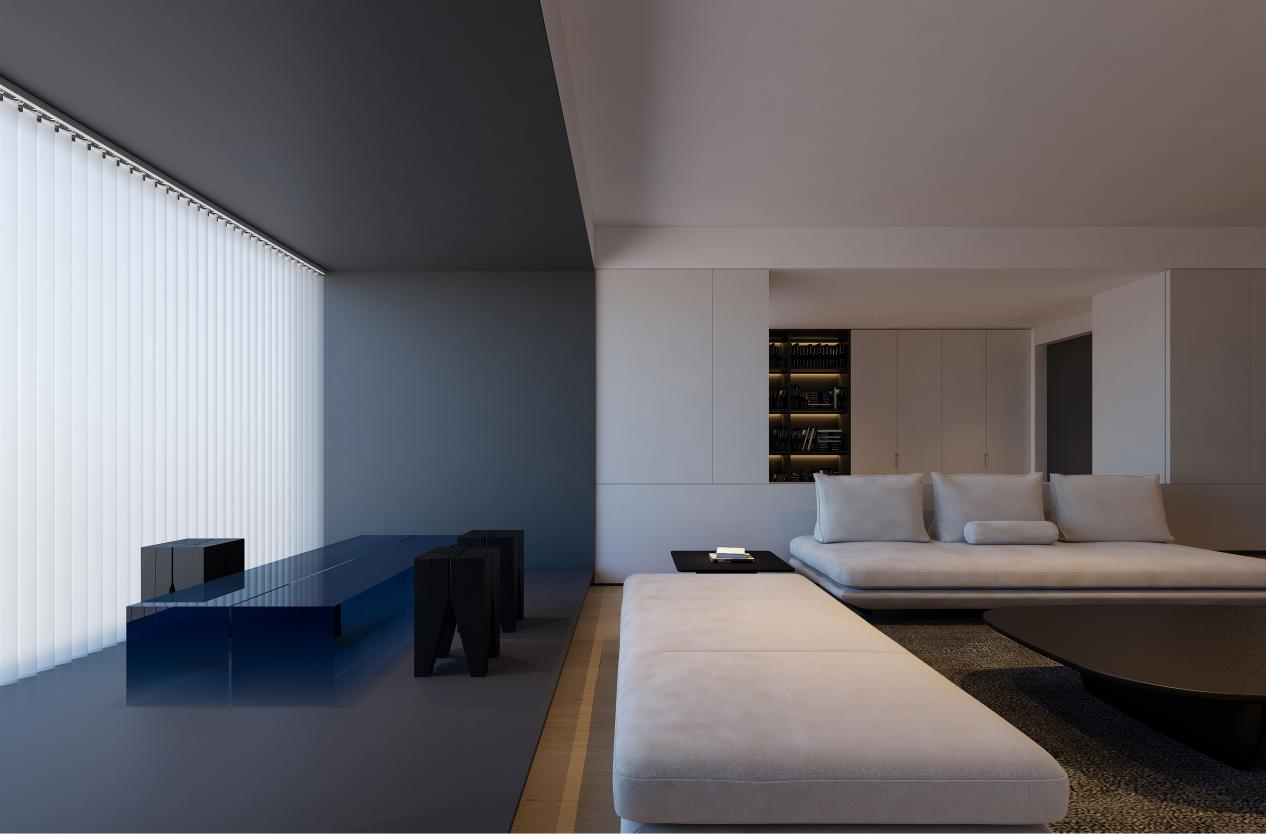 客厅的墙体使用了冷白色,与流畅简洁的线条构成了一个纯粹的居住空间。线性灯带和其他分散的光源营造了柔和的室内氛围,大量留白的天花板,可以让居住者的思绪飞向远方。灰色的皮质沙发,黑色实木的茶几,深灰色的地垫,无论是看上去还是躺下去,都能让人感受到舒适与放松。