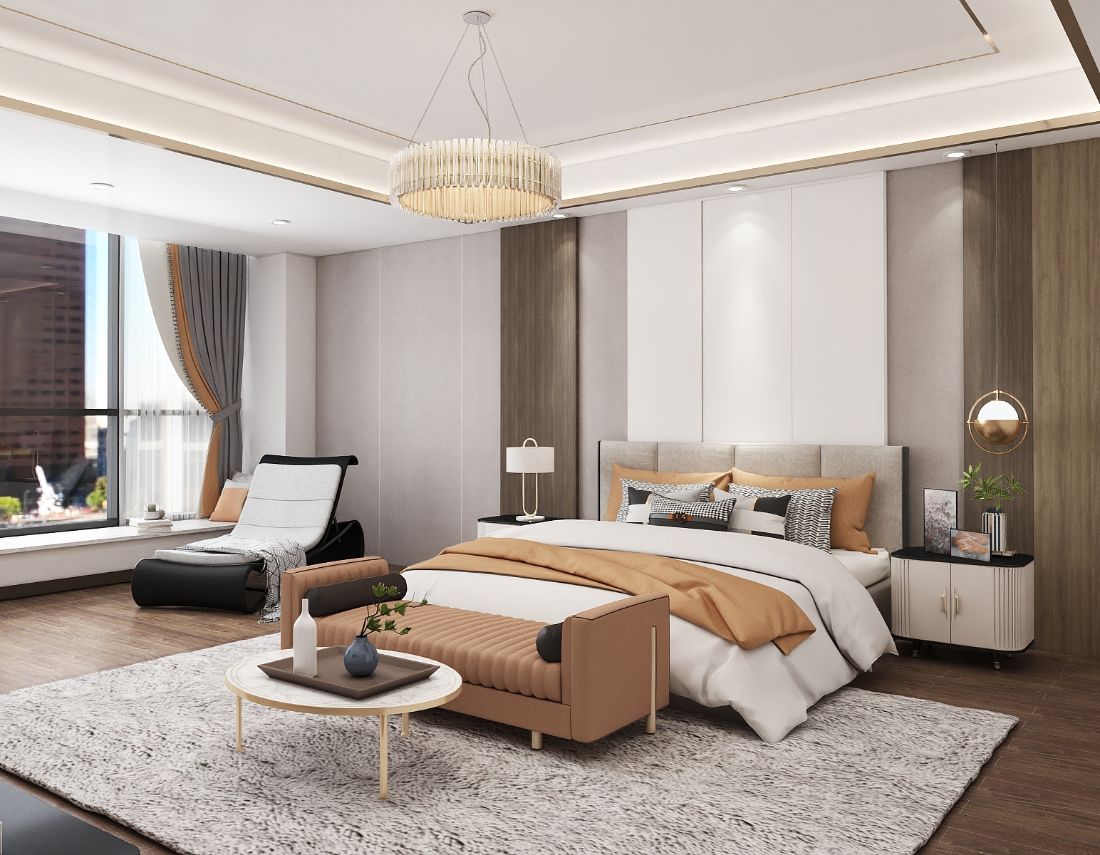 通铺木地板,温润有质感。方形的天花板嵌入金属线条,与圆形吊灯相得益彰,延续了整屋的高贵典雅的格调。阳光透过飘窗进照映在床上、休闲椅上,透露出慵懒安逸的气息,整个空间温馨感十足。