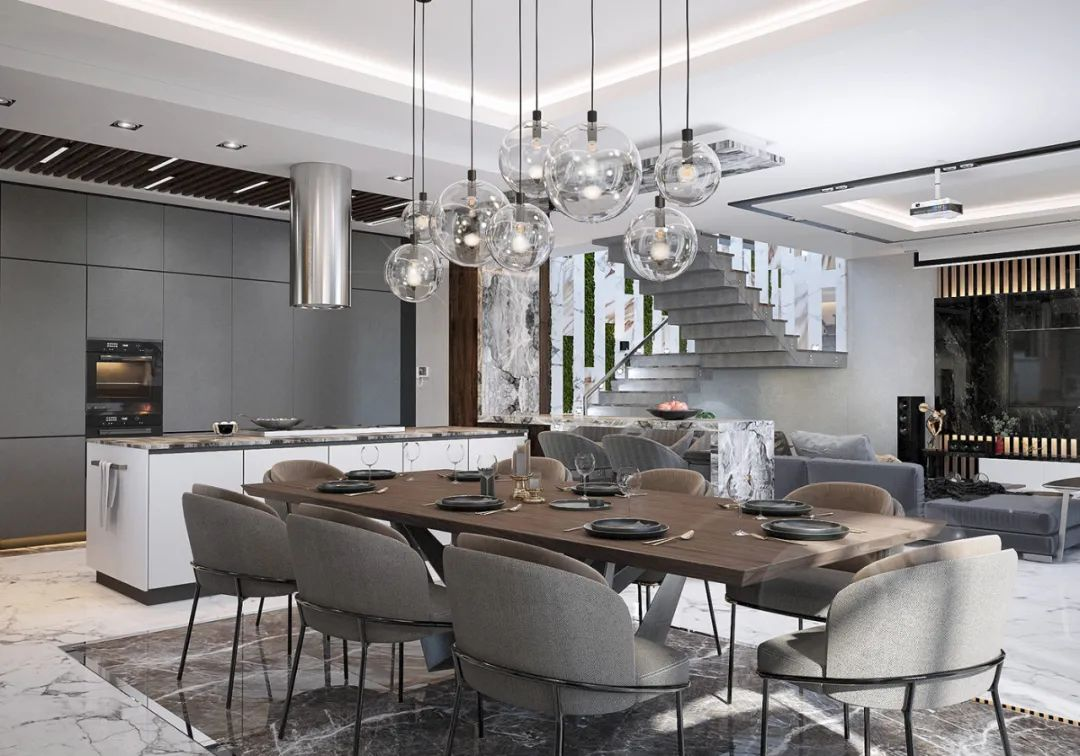 客厅以黑白灰三种颜色为基调,硬装和软装搭配和谐,没有丝毫突兀之处。餐厅区和客厅相通,地面的大理石带着时尚的气息,木质餐桌质感温润,餐桌上方的吊灯高低不一,丰富空间层次的同时赋予了空间温度。