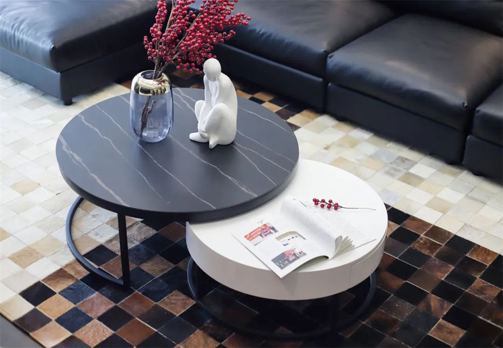 客厅铺设灰色瓷砖,饰以几何形制家具,别致圆形灯具和圆形茶几相得益彰,大落地窗将一线江景捕捉入室,带来舒适的视觉体验。