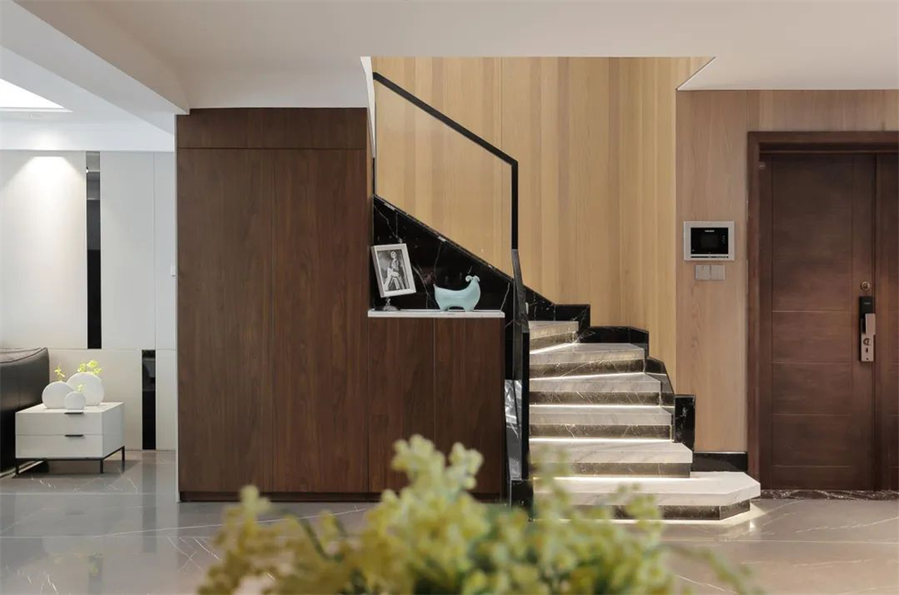 原楼梯中间是比较凌乱的。经过设计师跟业主的多次沟通,将它做成了精致且有质感的一个空间。楼梯黑色金属线条的设计勾勒出空间立体感,明暗和线条交织,每上一个阶梯就有一个等待环节,极其巧妙。