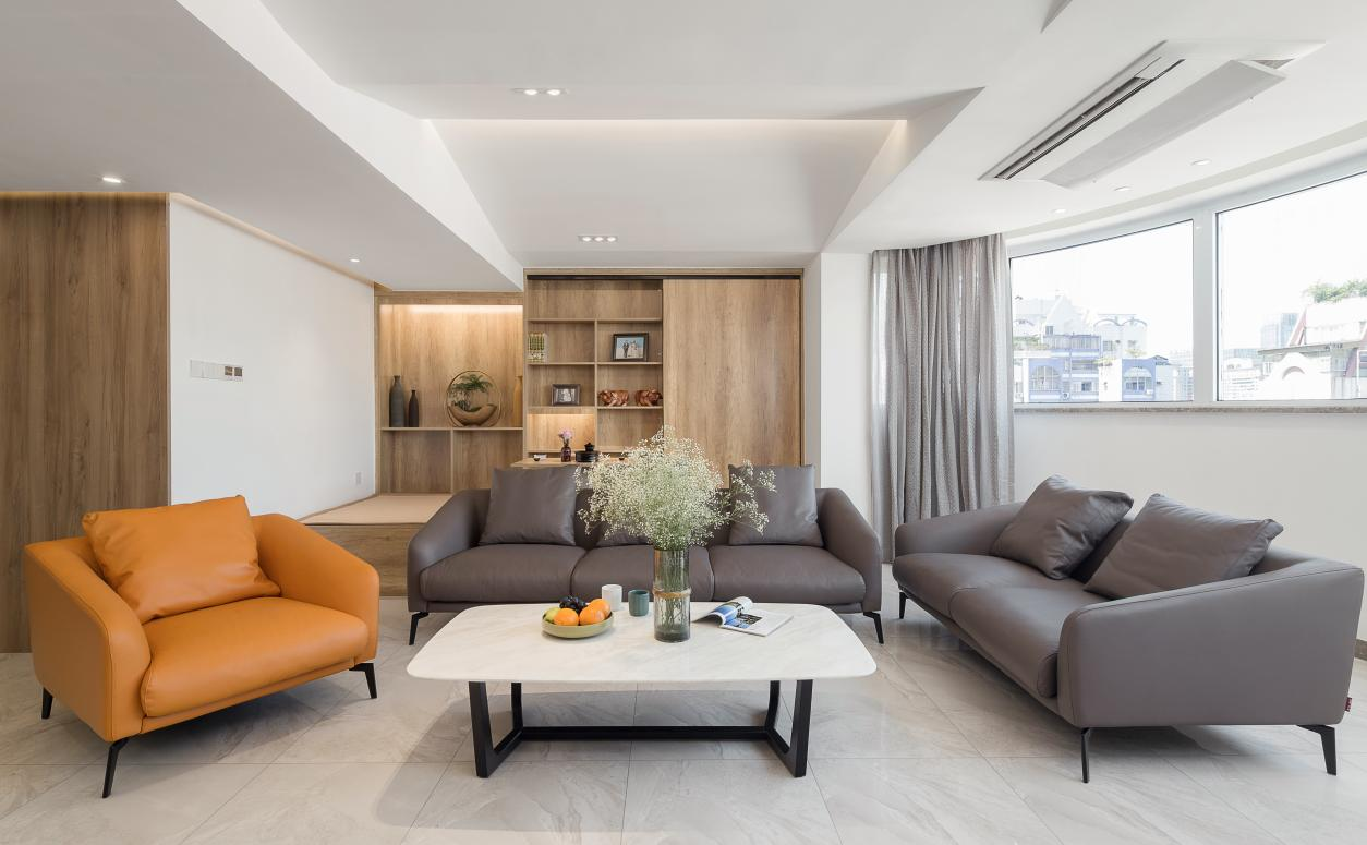 墙面与地板统一浅色,想要拒绝单调,沙发选取深灰色皮质沙发,加上爱马仕橙单人椅的点缀,另外木饰面背景墙、皮质沙发和大理石茶几,不同材质的软装巧妙糅合在同一空间内,瞬间提高空间质感。