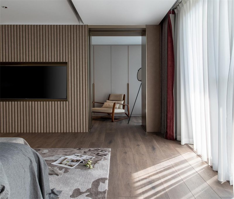 主卧给人的第一感觉是比较沉稳但又不失温暖感的。它在设计中保留了传统的文化内涵。低调内敛气质,宛如谦谦君子。结束一天忙碌后,躺在柔软的床上,在色彩和光影效果营造出的氛围下,相信很快便能进入梦乡。