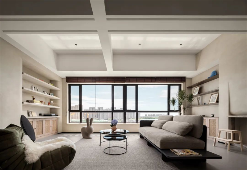 客厅是屋主使用频率最高的活动区,在整个家中具有重要的作用。这里的设计打破传统布局,不摆放传统的电视机,沙发也不靠墙摆放,营造出自由随性的空间氛围,屋主夫妇忙碌一天后可在此一起看书、听音乐或是静静地欣赏城市夜景,获得放松。