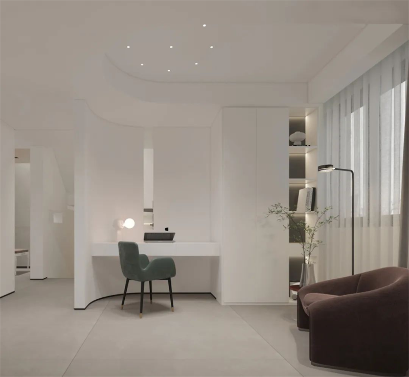弧形墙面背后设置了开放式书房。大面积的白,渲染安静素雅的氛围,点状分布式光源带来柔和的光,将温柔撒在这方天地。午后在这里喝一杯茶,读一本书,静享一段独处时光。