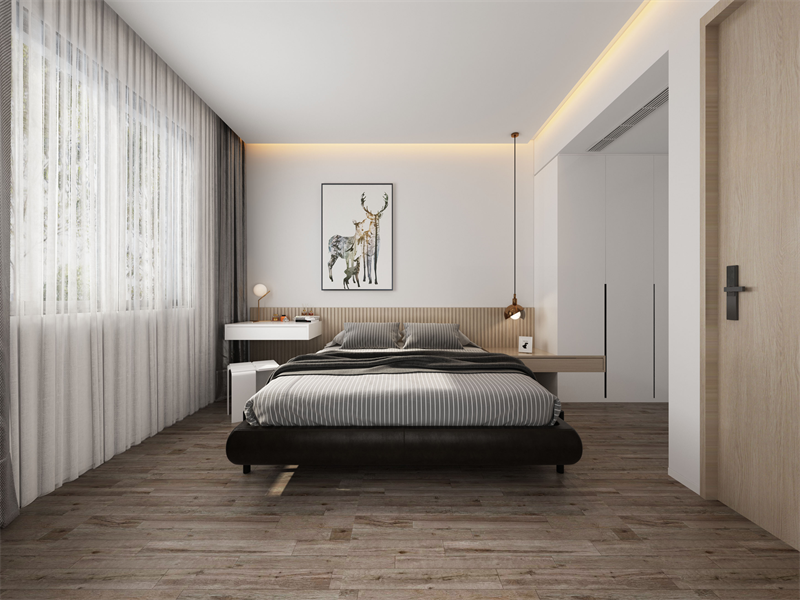一个舒适的空间,能让疲惫的身心得到放松,重聚能量,以元气满满的状态迎接美好的生活。次卧放了一个床头柜,一个置物架和衣柜,跟主卧比起来多了一些空间的设置。让整个空间色调温馨素雅。