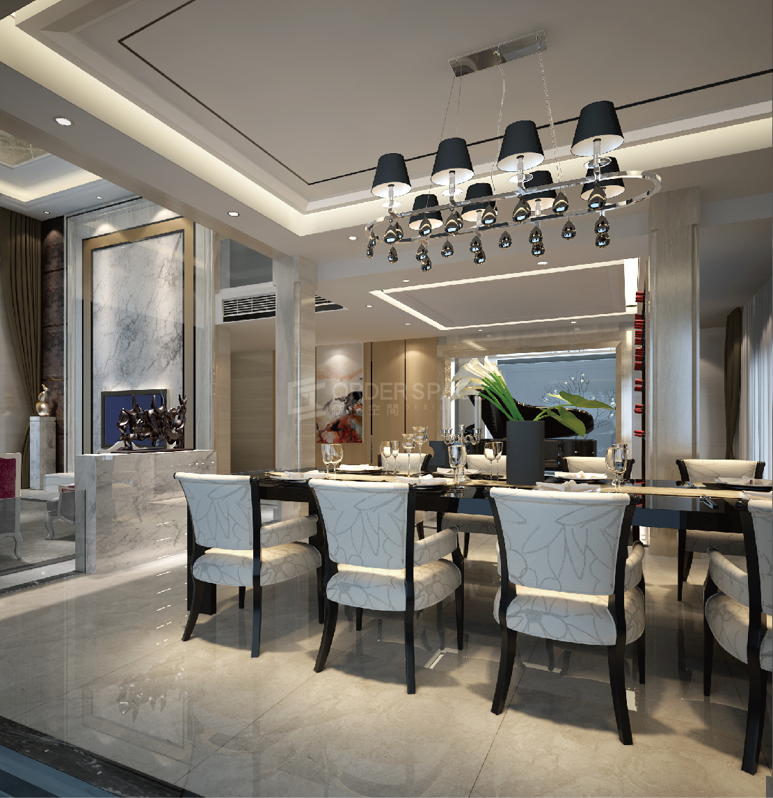 餐厅空间的设计细节尽显设计师的匠心,黑色酒柜的点缀背景,庄重典雅中不失时趣。设计师以层次的空间表现技法构筑一方雅致从容的生活居所,温暖了“回家人”的心。