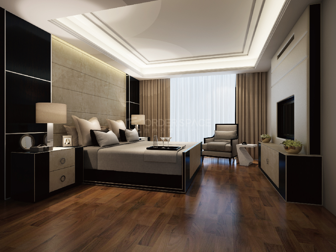 主卧延续整体空间色调,大地棕色的大面积铺陈赋予卧空间中含蓄,静谧的气质。窗外景色正好,树梢头上,鸟儿浅唱,一种安谧宁静的意境油然而生,一天繁忙的工作后于此独享归家的恬淡闲适。